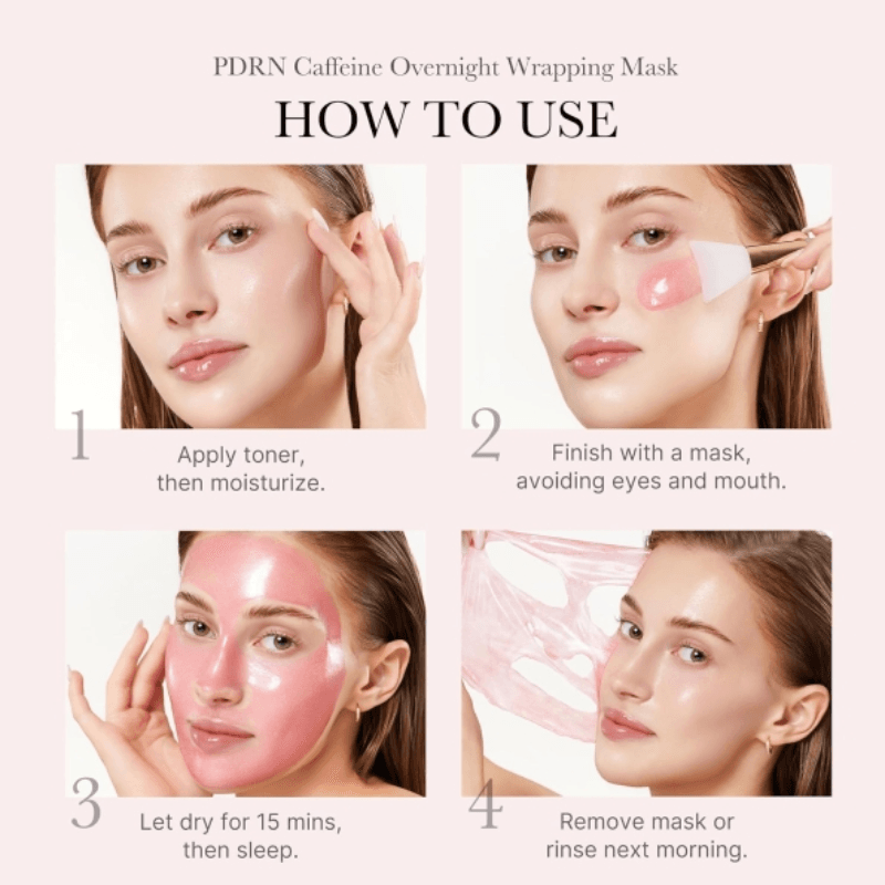 Una "máscara glass skin" nocturna brillante de color rosa perla que se fija en una película delgada que se adhire a la piel mientras duermes. Infundido con PDRN (ADN) derivado del salmón y cafeína, está diseñado para:
